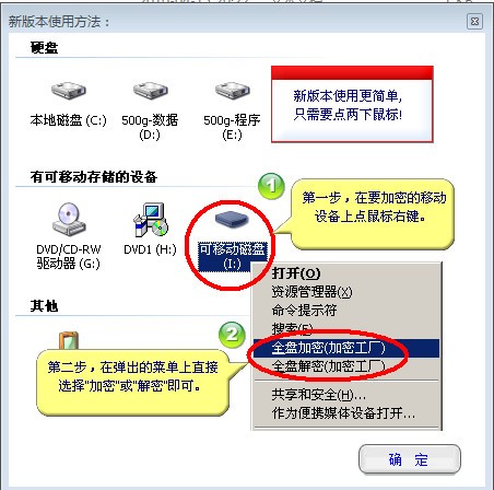 免费的u盘加密功能,安装加密工厂之后插入U盘。轻点鼠标右键在弹出菜单中选择使用整盘加密。操作极为简单,将加密过的U盘插入其他电脑中,会发现无法打开U盘。这样就算您的U盘丢失上边的信息也无非丢失,最大限度的保护了您的个人重要信息外漏的情况。