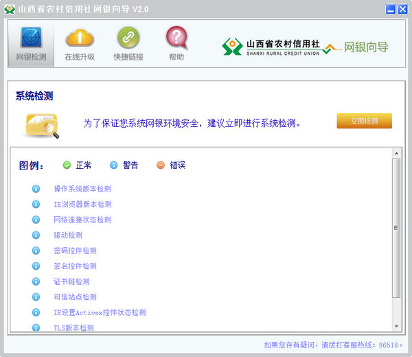系统检测将对您的操作系统进行快速扫描,检测出网络连接状态是否有问题、驱动安装是否完整、控件安装是否完整、证书链是否已经注册、是否将https://ebank.shanxinj.com/加入可信站点、检测IE设置Activex控件状态是否正常等。