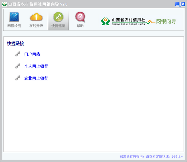 山西省农村信用社网银向导提供了必须的系统检测与修复功能,另外还有在线升级以及快捷链接的功能。