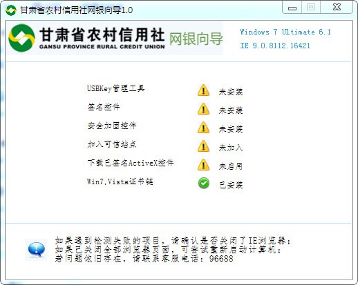 甘肃省农村信用社网银向导是在电脑上登陆甘肃省农村信用社网上银行的辅助工具,它能帮助您配置甘肃省农村信用社网上银行的使用环境,以便您能顺利的登陆和使用甘肃省农村信用社网上银行。