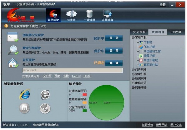 锐甲是一款主要用于web防挂马的免费工具,具有轻载高效的特性,锐甲同时具备良好的兼容性、稳定性,不会与其他软件发生冲突。锐甲集防挂马、U盘免疫、U盘木马拦截等功能于一体,通过阻断钓鱼网站、拦截恶意网页能有效防范网页挂马,通过免疫U盘、拦截U盘木马能有效切断病毒传播途径。锐甲可对用户使用搜索引擎的搜索结果进行审查,并标示钓鱼、恶意及色情等不健康网站,和可信的健康网站。目前可支持百度搜索引擎,google搜索引擎,Live Search搜索引擎。