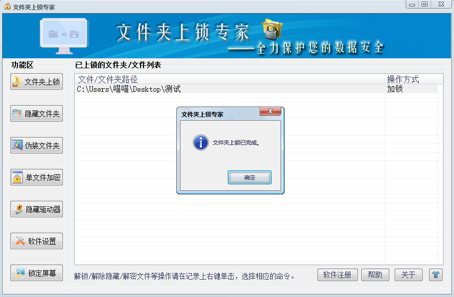 文件夹上锁专家是一款适合个人和企业用户对私密(秘密)文件(文件夹)进行加密的系统加密工具,软件具有界面漂亮友好、简单易用、稳定无错、功能强大和兼容性好等特点,支持最新的Windows操作系统。支持快速加密和高强度加密两种加密方式,以适合不同用户对文件安全的需求,采用快速加密方式时它的加密速度极快,上GB的数据仅需数秒钟完成。使用高强度加密方式加密时,尽管加密速度会慢一点,但加密后文件夹内容非常安全,坚不可破,特别适合要求数据保密性极高的用户。文件夹锁定后用户无法进行复制、删除、移动、重命名等操作。