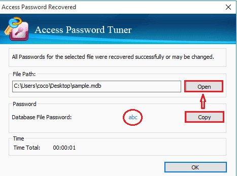 恢复Access数据库文件加密密码后,将弹出以下对话框。您看到对话框上显示的密码了吗?现在可以使用它来解锁锁定的访问数据库。单击复制→打开,然后粘贴密码以打开数据库。