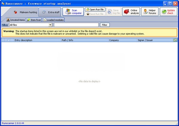 RunScanner 是一个国外完全免费的Windows系统工具,您可以用它轻松地将隐藏在您系统中的autostart 程序,spyware,adware,主页劫持,未经认证的驱动揪出来,并可以导入和导出报告以帮助别人或获取帮助.目前它可以扫描74个容易隐藏恶意软件的地方