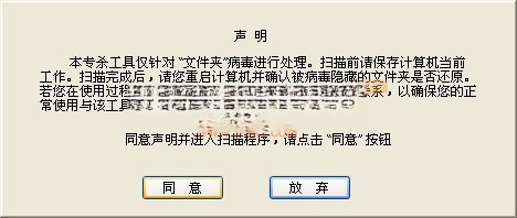 当扫描按钮被激活后程序会对操作系统进程及其磁盘文件自动进行扫描,杀死病毒进程,修复被隐藏的文件夹。