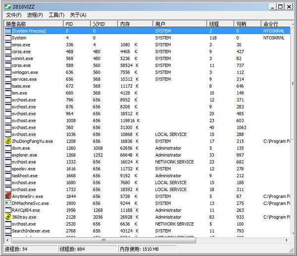 进程信息:名称、PID、用户、线程数、句柄数、命令行等。