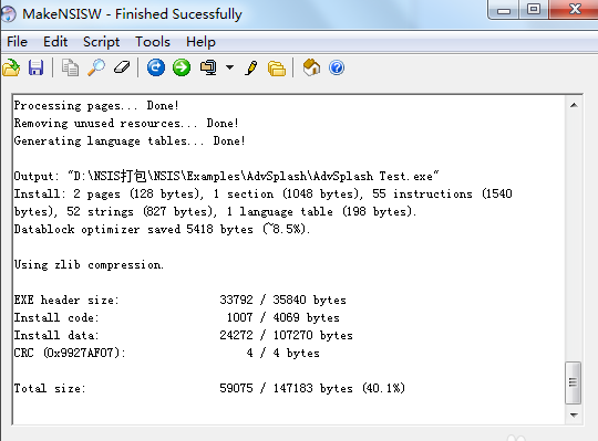 3、打开MakeNSISW,即脚本编译器,载入脚本,可生成打包程序,Output显示生成安装包的目录。