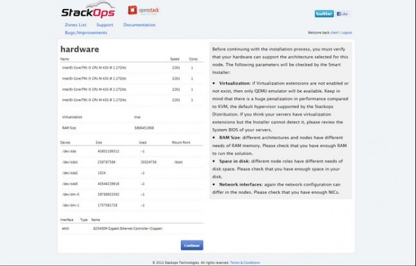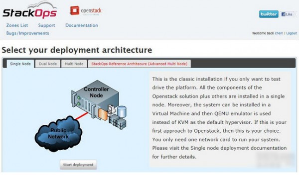 经过几分钟安装,我们就可以到客户端上连接服务器了,打开 http://ip地址:8888 ,将立刻跳转到http://installer.stackops.org,这时需要注册一个用户,用刚刚注册的用户登录,就能看到如下画面。