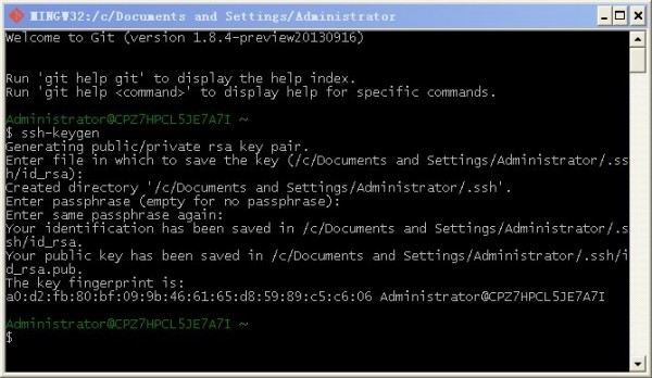 6,上图中会提示公钥生成在 C:\Documents and Settings\Administrator\.ssh 目录中,找到目录 ,里面有id_rsa.pub文件,用记事本打开,然后把里面的东西 全选复制。