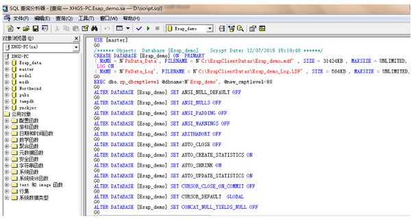 2.现在 sql2000 中新建空数据库 如 Esap_demo 将导出的脚本导入SqlServer2000 查询分析器中 执行 如下图: