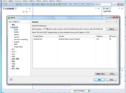 使用Eclipse进行android应用开发需要给Eclipse装adt插件,这样Eclipse就可以和android sdk建立连接,可以在Eclipse中启动android模拟器进行程序调试等ADT插件安装这里不再累赘,插件的安装URL为:也可以下载adt的zip包安装 安装完插件后,需要做一些简单的配置: