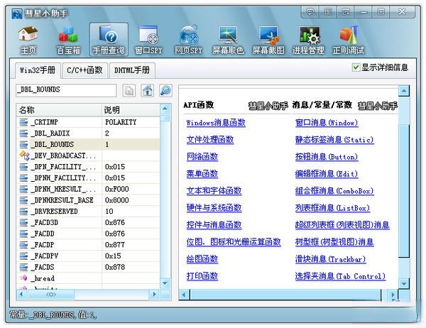 彗星小助手下载,可以查询Win32函数、C以及C++函数、DHTML函数,软件可以探测程序窗口的函数信息,具有屏幕取色、截图和进程管理功能,是程序开发、制作软件的必备工具,用来分析窗口SPY,探测、操作外部窗口非常不错哦。