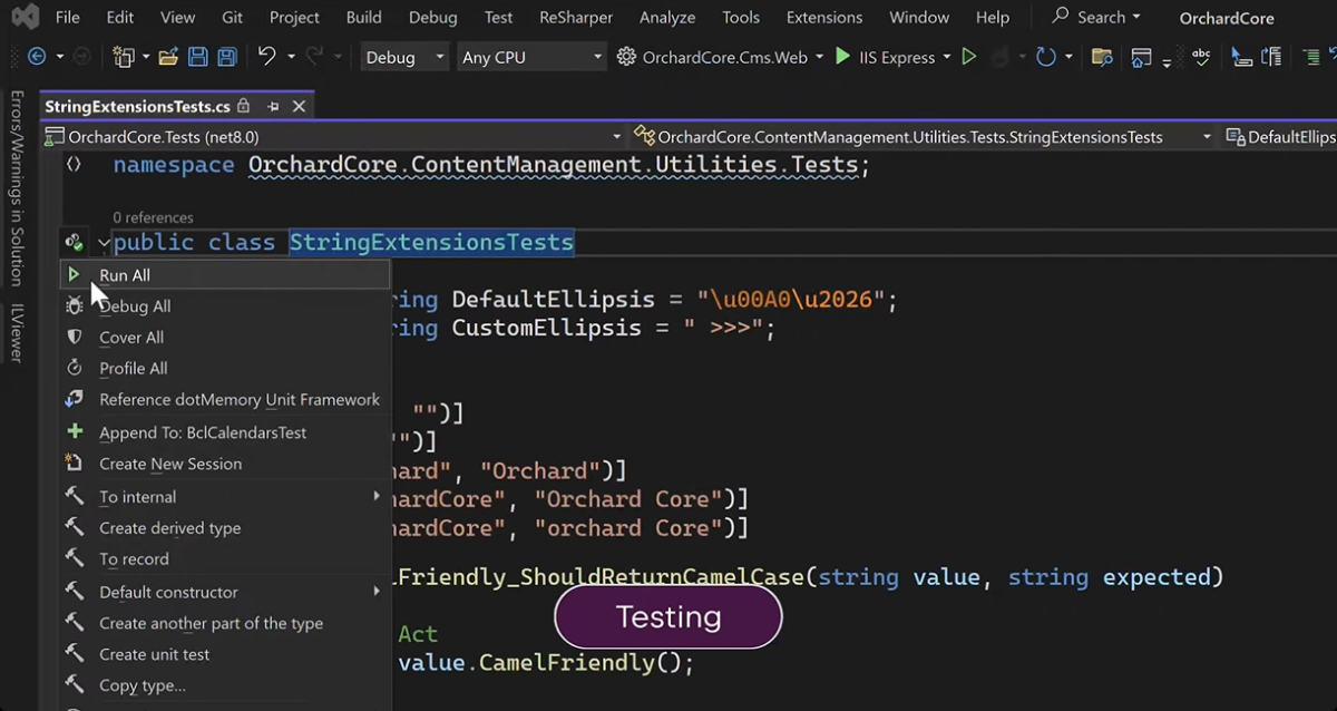 在 C#、VB.NET、XAML、ASP.NET、HTML 和 XML 中进行实时代码质量分析。 ReSharper 会让您知道您的代码是否可以改进并建议自动的快速修复。