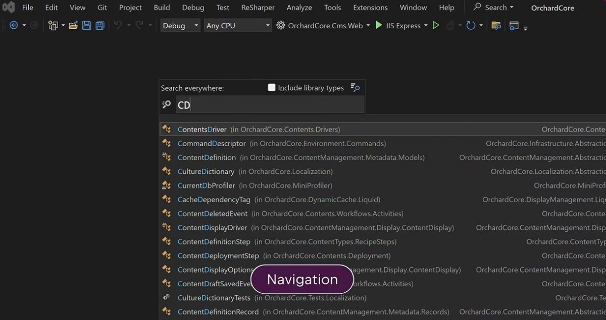导航功能可以帮助您立即遍历整个解决方案。 您可以快速跳到基本代码中的任何文件、类型或成员,或者从特定符号导航到其用法、基本符号与派生符号或者实现。