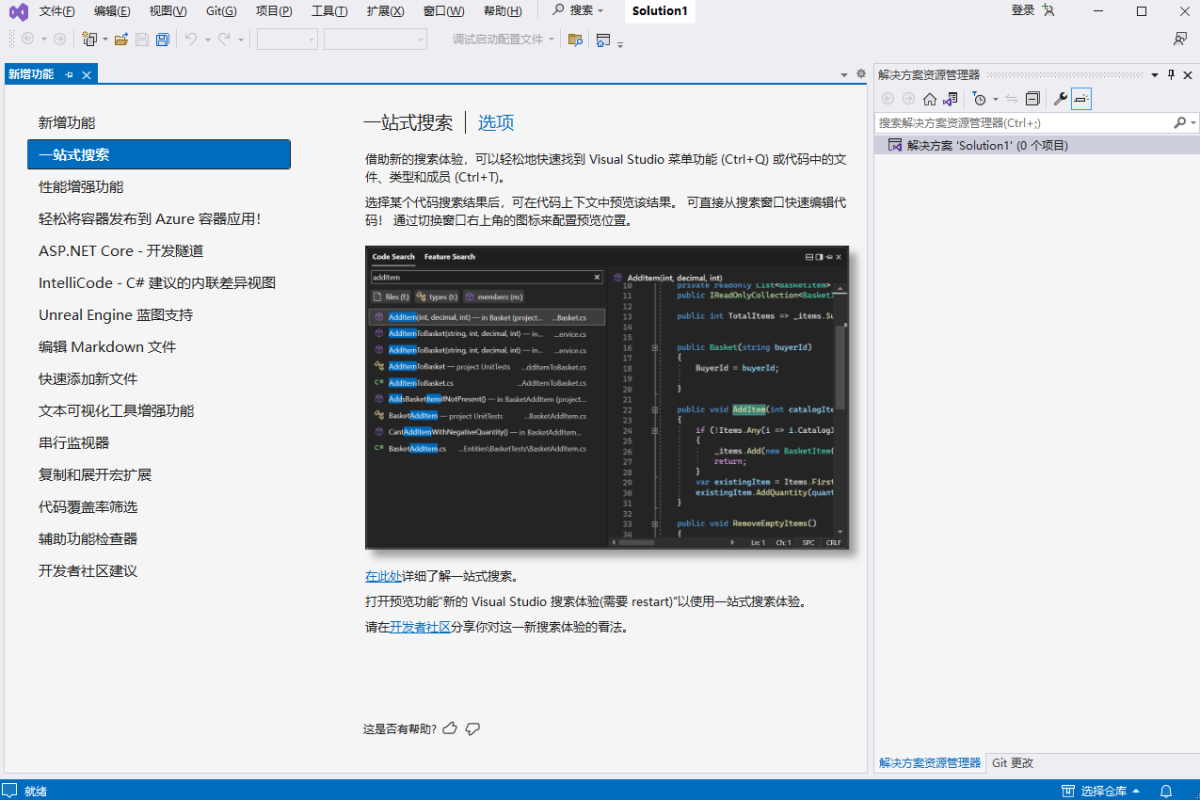 将 Git 用作开箱即用的 Visual Studio 中的默认源代码管理体验。 从新的 Git 菜单中,可以根据 GitHub 或 Azure DevOps 创建或克隆存储库。 使用集成的 Git 工具窗口提交并推送更改对代码的更改、管理分支、与远程存储库同步以及解决合并冲突。