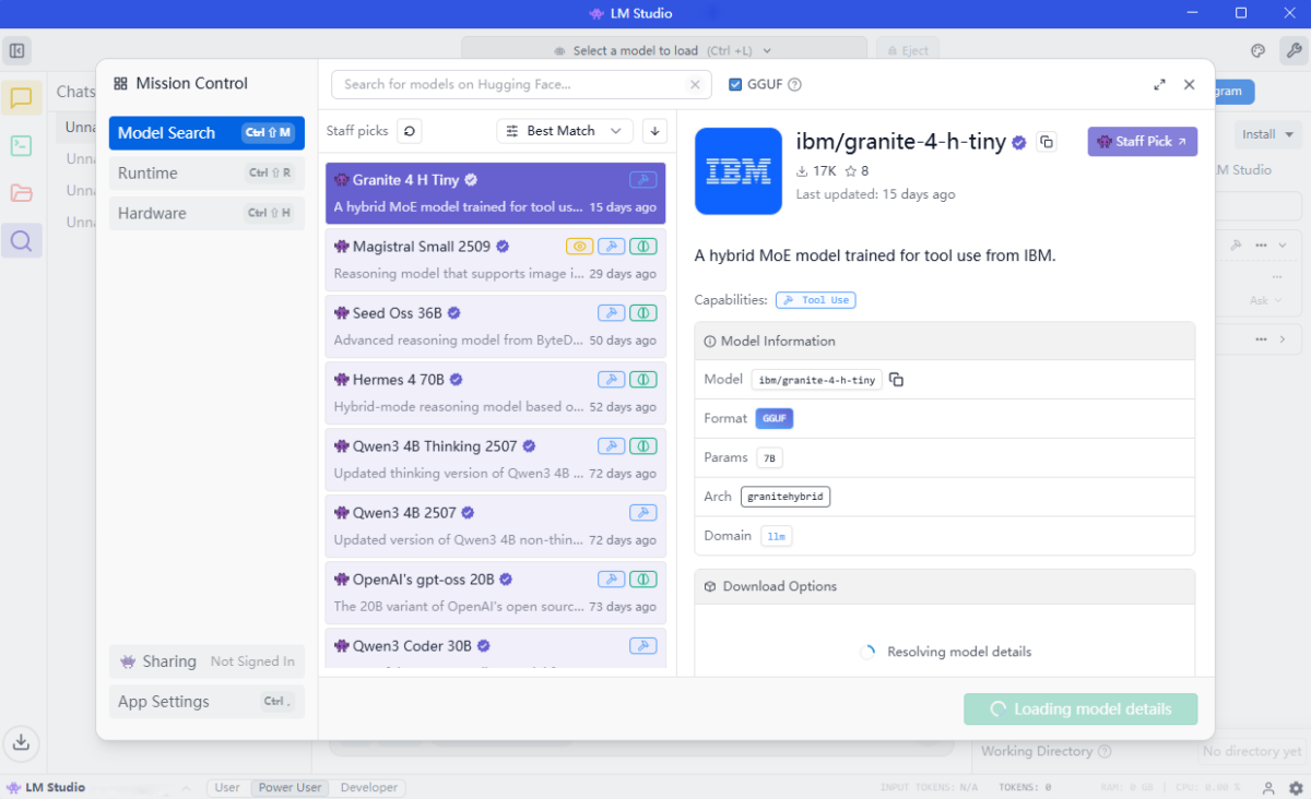 用户可以选择安装社区推荐的模型,或者在 Huggingface 等平台上搜索并找到所需的模型。LM Studio 会检查用户的本地系统,并推荐哪些模型可以在用户的计算机上运行,用户可以根据计算机的能力选择合适大小的模型。