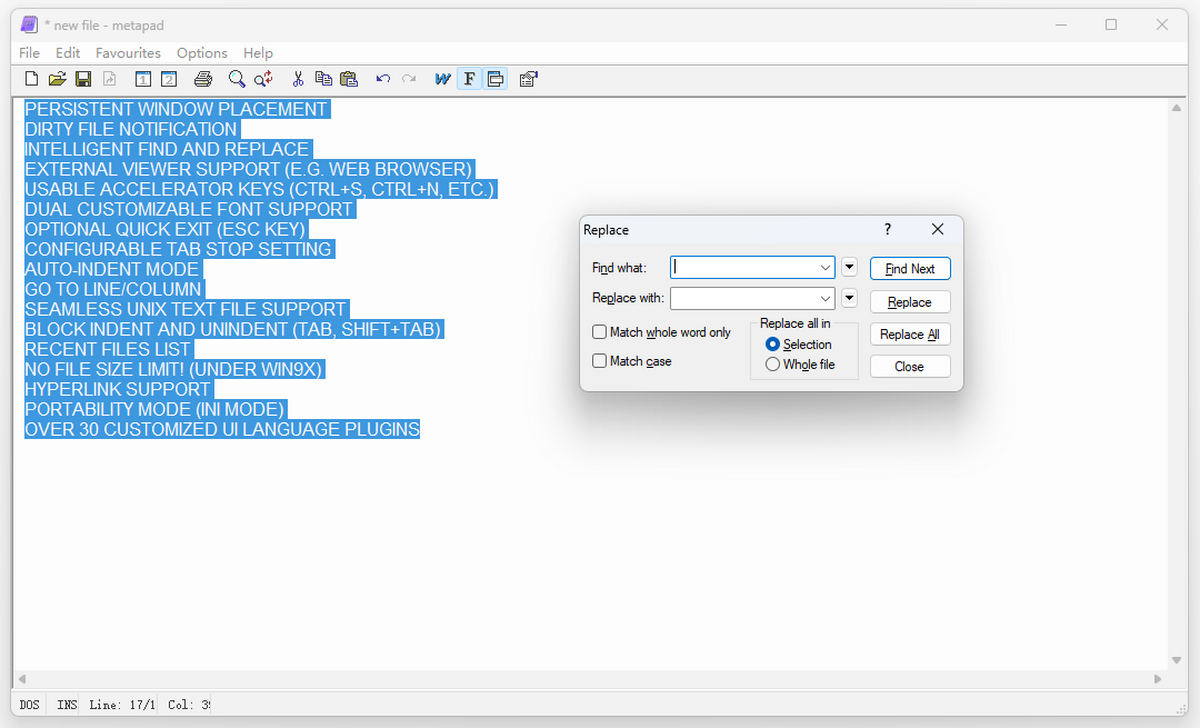 Metapad 是一款小巧、快速的 Windows 文本编辑器,功能类似于 Microsoft 记事本,不受文件大小的限制,可以开启超大型的文件,所见即所得的打印;支持 DOS 文本、UNIX 文本以及 Unicode、Unicode BE 格式的文件。另外还有诸如自动缩进,自定义制表符长度,支持收藏夹以及在 Windows 2000 下支持透明模式等等自己的特色。