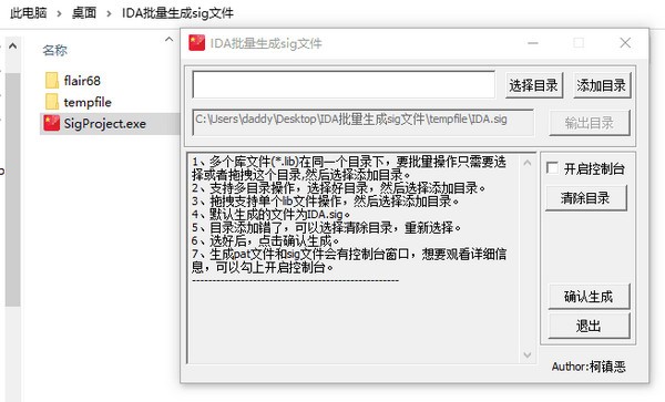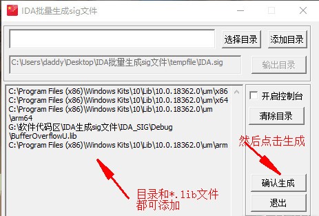 IDA批量生成sig文件工具开发平台是vs2017,在win32编写,可以生成IDA.sig文件,支持目录的无限添加,适合需要经常sig文件的朋友使用!