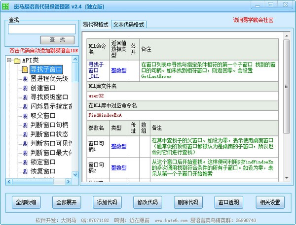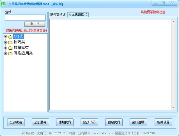 斑马易语言代码段管理器是您学习易语言必不可少的一个工具,它使您的收藏代码不在混乱,查找分类和双击就可将代码发送到易语言代码界面,都是一个很方便的工具。