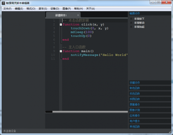 触摸精灵脚本编辑器是触摸精灵的PC版,可以直接在电脑上面编辑脚本。使用触摸精灵的用户,可能会觉得在手机上编辑脚本有点儿不方便,所以官方发布了这款触摸精灵脚本编辑器PC版,可以在电脑上直接编辑脚本,同时支持安卓版和苹果版触摸精灵。