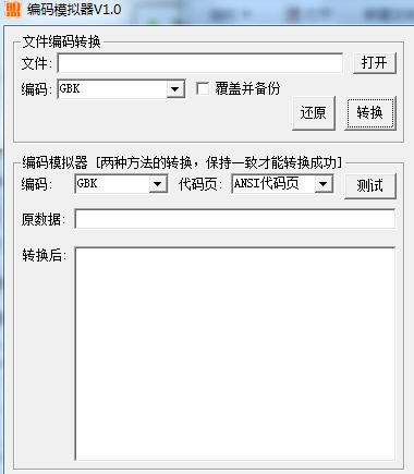 编码模拟器支持ANSI编码,GBK,UTF-16LE,UTF-7,UTF-8的转换功能和替换功能,工具小巧,使用方便。