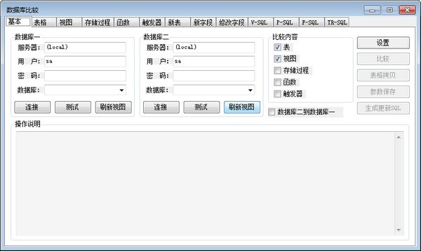 数据库比较可以比较不同数据库实例之间结构的差异、表数据的差异以及过程函数之间的差异,支持MySql, Oracle, Sql Server 2000三种数据库,是一款非常实用的数据库应用工具。