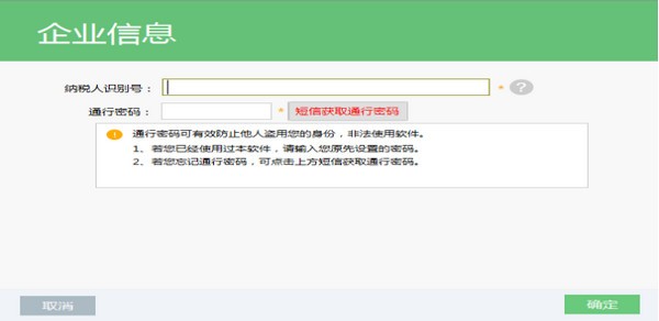 初始化:登录软件后,弹出企业信息窗口,用户据实填写纳税人识别号、通行密码