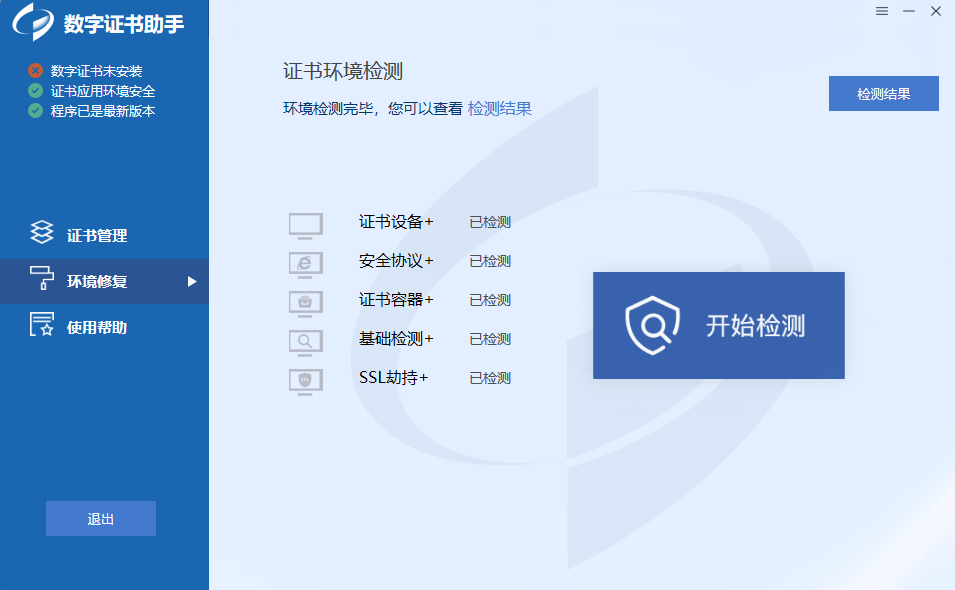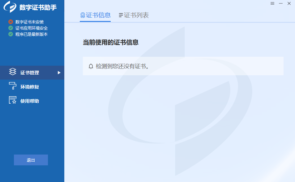 证书助手-统计局专版是为帮助用户更有效地使用数字证书而提供的客户端工具,能有效地进行数字证书的生命周期管理,包括证书的下载、重新下载等操作,同时具备环境检测、修复以及错误情况上报的功能。