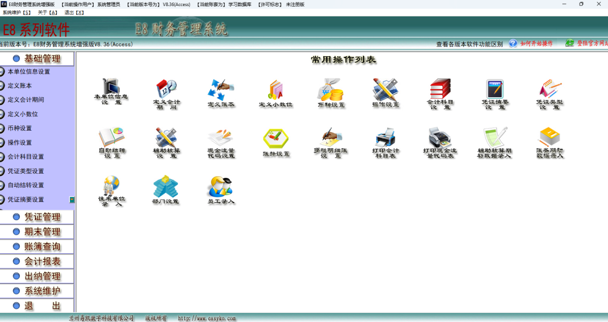 E8财务管理软件增强版包括凭证编制、修改、审核、查询、打印,电子发票管理,出纳管理,明细账管理,总账管理,财务报表管理,辅助核算管理,往来账管理,现金银行日记账管理等诸多功能。
