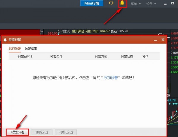 4.设置股票预警,点击右上方铃铛图标,弹出股票预警窗口,点击添加预警