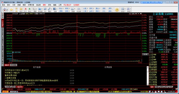 指数条:用来显示上证指数、深证指数、沪深300指数以及涨跌和成交金额、成交金额分为两部分,股票加权证,“总”显示的则是两市的股票和权证的成交金额之和。