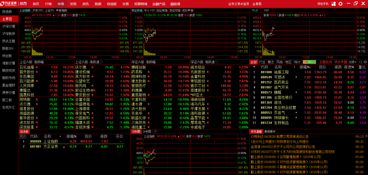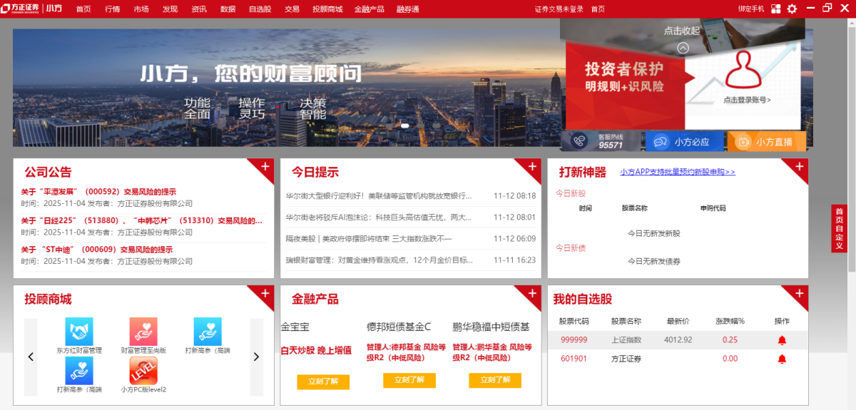方正证券小方是一款全功能、全景资讯、智能分析的行情交易客户端,包括行情交易、泉友商城、金融产品、市场全景、发现事件、资讯频道、一键打新、实时分析及数据解读等功能。