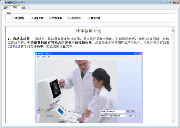 工作站设备构成:Windows操作系统电脑主机,分辨率大于等于1000X768的显示屏,打印机 ,一只视频采集卡,一根视频线,一只USB脚踏开关,黑白或彩色超声诊断仪。详见本软件帮助说明。