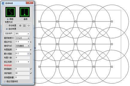 温感烟感:提供自动布置和手动布置两种方式;接线方式与感应半径布置高度等参数均可以进行设置,在布置过程中可以进行感应范围预览。