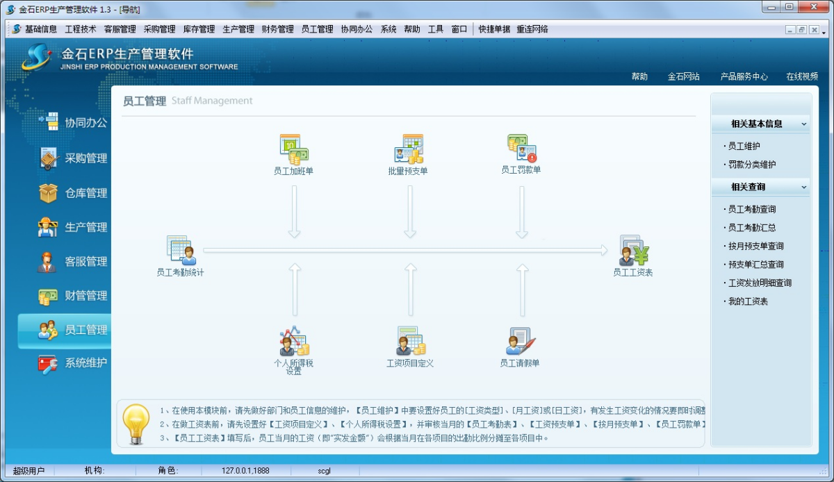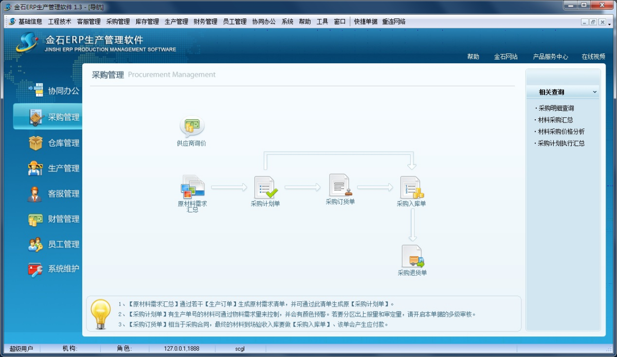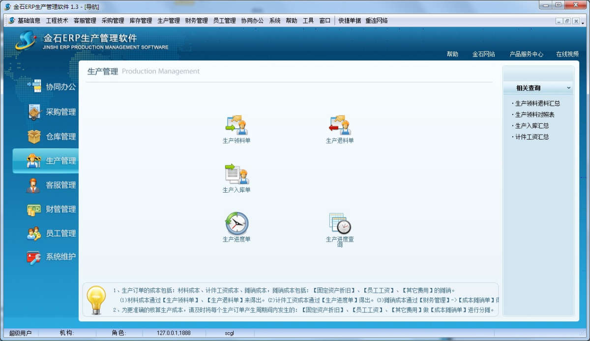 金石ERP生产管理软件是一套专业的企业生产管理软件,根据国内众多生产企业实际情况研发,可以对订单和生产进度的执行情况进行随时监控,做到对订单数量是多少、已交货数量、已生产数量、未交货数量及是否延误交货期等信息了如指掌。同时可以随时查询某种物料的进、销、存状况。