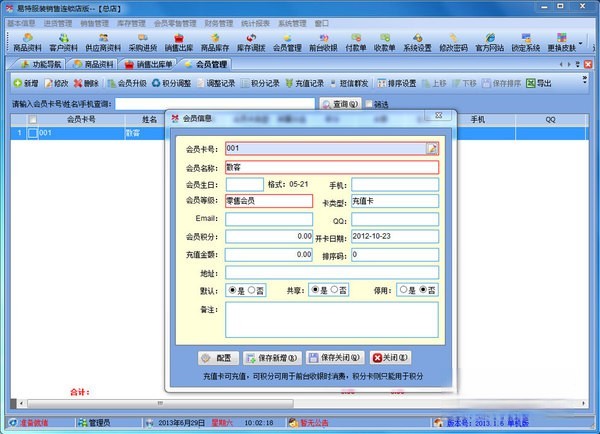2、支持会员管理。可设置会员级别,不同级别可以适用不同的价格与折扣.可以自动计算会员的累计消费、累计积分、兑现积分及剩余 积分情况。过生日的会员可自动提醒;