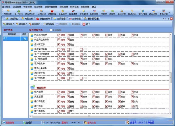 12、权限设置功能强大.可以设置每个员工的菜单操作权、单据操作权、分店操作权及其他操作权限{比如:查看成本权(即能不能看到 进价及毛利)、售价调整权(即能不能在销售时修改售价及折扣)等};