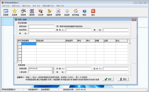 伊特物品管理软件是一款面向企事业的辅助管理系统软件,包括物品申请单、采购单、领用单、借用单、归还单、调拨单、报损单、报溢单、库存报表,紧紧围绕物品管理各个环节进行监控。