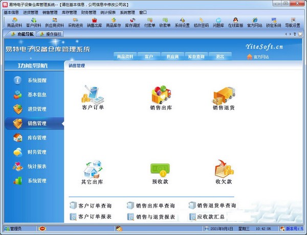 易特电子设备仓库管理系统是一款专业的针对电子设备行业进行设计管理的系统,可适用于各种电子设备商品仓库进行库存管理,其中包含商品销售管理系统 ,库存管理系统(仓库管理系统),财务和报表系统等子模块。