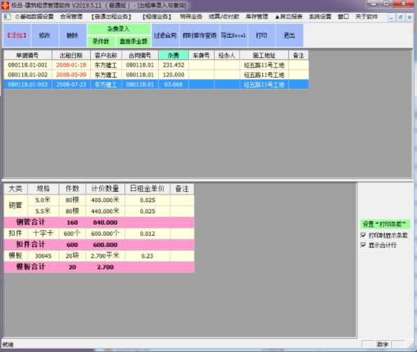 1.租金每天都在变化,怎么才能做到随时查看?各种材料在客户中的结余量分布情况?每天的日租金是多少?各租赁单位的租赁费用是多少?租入和租出的各项明细及汇总数据是什么?各租赁单位的材料结余量是多少?各种规格的材料是否存在多还或者少还的现象?6米的钢管客户需要800根,库存现在还剩多少?......老板们操不完的心,费不完的神!极品建筑租赁软件一登场,鼠标一点全解决。