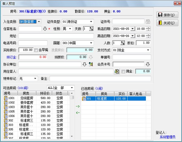 操作方法二:在实时房态图上选择需要预定给客人的房间→单击菜单栏上的[预定接待]→选择[客人预定]菜单项→进入[客人预定]窗口→输入客人信息后保存即可。