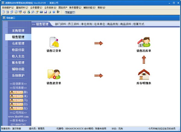 一、速腾电动车管理系统官方版拥有基本功能:智能订货、进货入库、进货退回、销售出库、销售退货、报损、报溢、调入、调出、拆零、组装、盘点、收款、付款、预收、预付、收入、支出、成本、利润及财务会计核算等。
