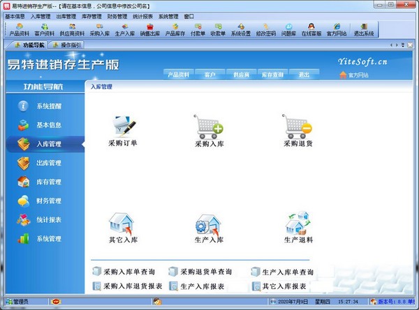 易特进销存生产版是一款专业的进销存管理软件,其中包含产品销售管理系统 ,库存管理系统(仓库管理系统),财务和报表系统等子模块。 有需要可以下载。