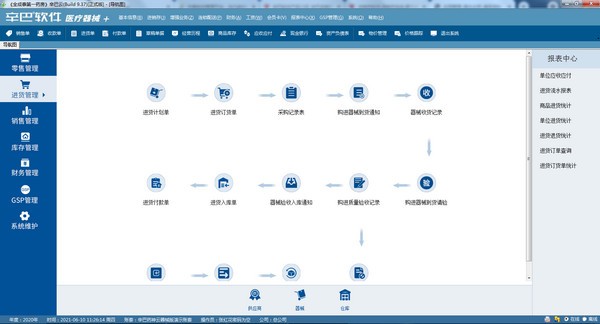 核算处理企业医疗器械的购进业务过程,可以方便的进行进货入库,管理医疗器械的保质期和进货企业的资质,同时根据进货入库单付款方式形成相应的应付款。