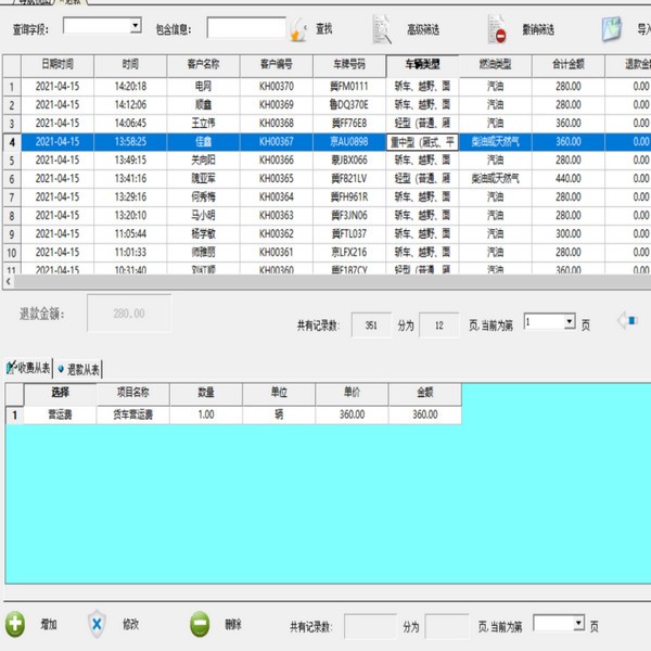 主表:客户编号 客户名称 车牌号码 车辆类型 联系人 联系电话 客户类别 初始金额 经办人 备注说明