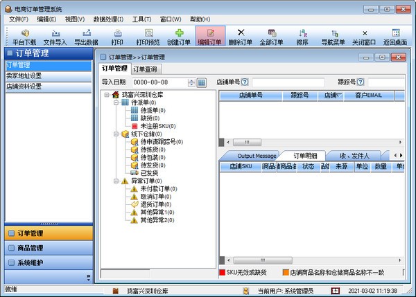 电商订单管理系统是一款简单实用的店铺订单管理软件,用户能够通过电商订单管理系统对企业的多平台多店铺订单统一管理,可以统一对订单进行处理,还能够进行系统维护,如仓库资料以及人员管理等,十分方便。