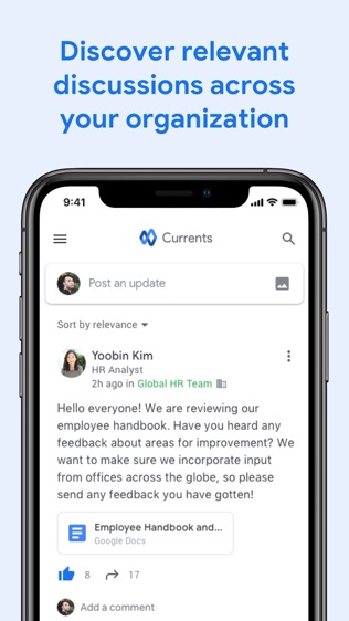 G Suite 版 Currents 可让你随时随地与同事交流互动。