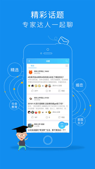 在这里,青年可以直接在手机上向共青团专家提问、回答、评论,也可以自己发布有意思的话题和帖子。在拥有更流畅的移动阅读体验的同时,实现了移动端、PC端和微博端上青年和团中央的实时互动,反映青年呼声、回应青年诉求、维护青年权益、服务青年成长,是青年与团中央直接互动交流的新媒体平台,更是共青团组织牵手青年,感知青年脉搏的心之桥。