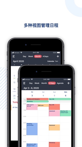 Tiny Calendar支持8种标准视图 - 天,周,月,4天,年,迷你月(iPhone),周列表(iPhone)和任务视图。通过这些视图你可以直观地找到某个事件或者某个时间点。