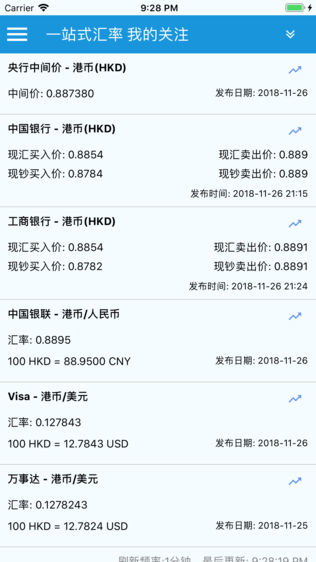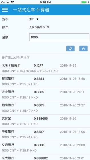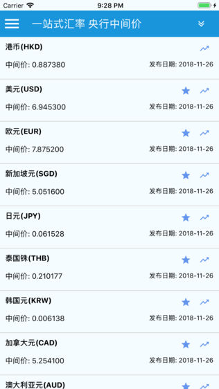 一站式汇率实时公布央行外汇管理局的中间价,各大银行(中国银行,中国工商银行,中国建设银行,中国农业银行,交通银行等等)的外汇牌价,支付宝,微信,以及卡组织银联, Visa和Mastercard的汇率。包含美元,港币,欧元,新台币,英镑,加拿大元,日元,新加坡元,新西兰元等各种常见货币的查询,以及汇率计算器。